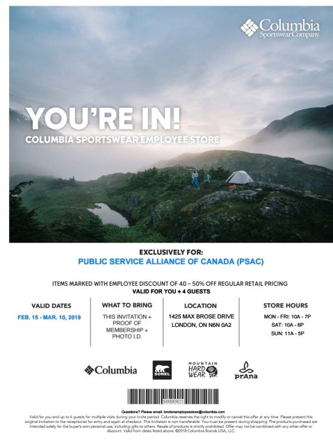 You’re Invited to Columbia Sportswear’s Employee Store! ( Public Service Alliance of Canada (PSAC) )