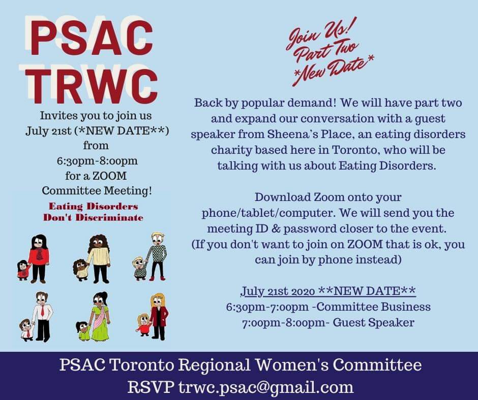 “Eating Disorders Don’t Discriminate” New date July 21st. Open to all PSAC members who identify as a Women.