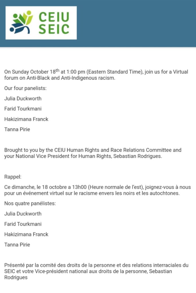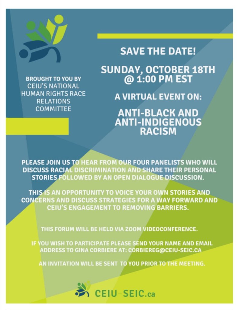 CEIU HRRR COMMITTEE PRESENTS anti Black and anti Indigenous racism virtual event- Oct 18th, 2020