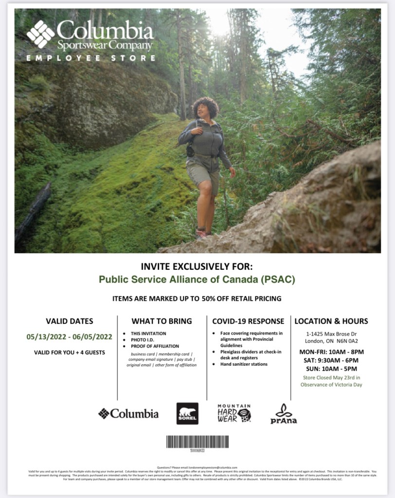 Public Service Alliance of Canada (PSAC) has exclusive access to the Columbia Sportswear Employee Store from May 13th – June 5th only! The bulleted information below is a helpful guide to share with your team.