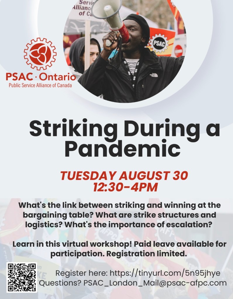 We hope you can join us for the “Striking During a Pandemic” on August 30 from 12:30 – 4pm. Registration is limited and there is paid leave available for participants to attend. Register here: https://psac-afpc.zoom.us/meeting/register/u5AqdeiprTMoGNGmazDxuPdsW9VZRGpNLaHo.