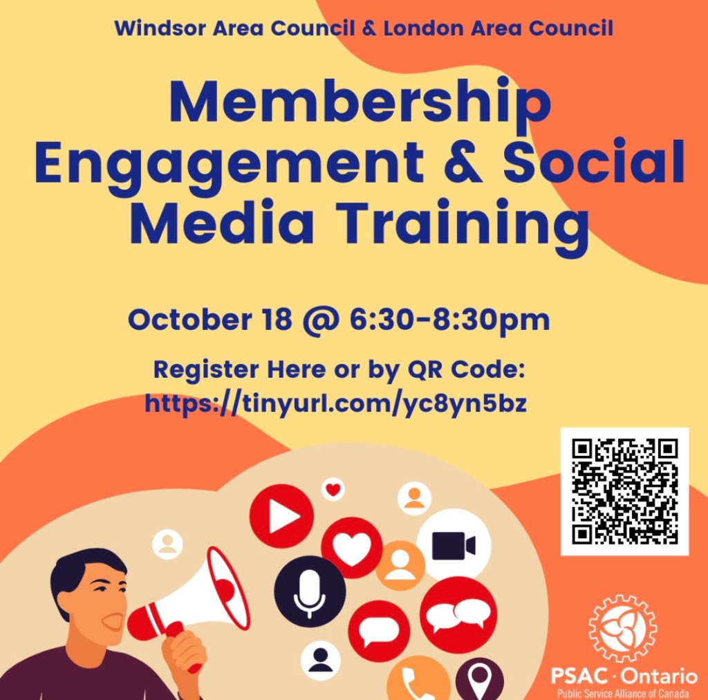 The PSAC Windsor Area Council and London Area Council are inviting you to join an upcoming two-hour virtual workshop on Member Engagement and Social Media Training on Tuesday, October 18 @ 6:30-8:30pm.