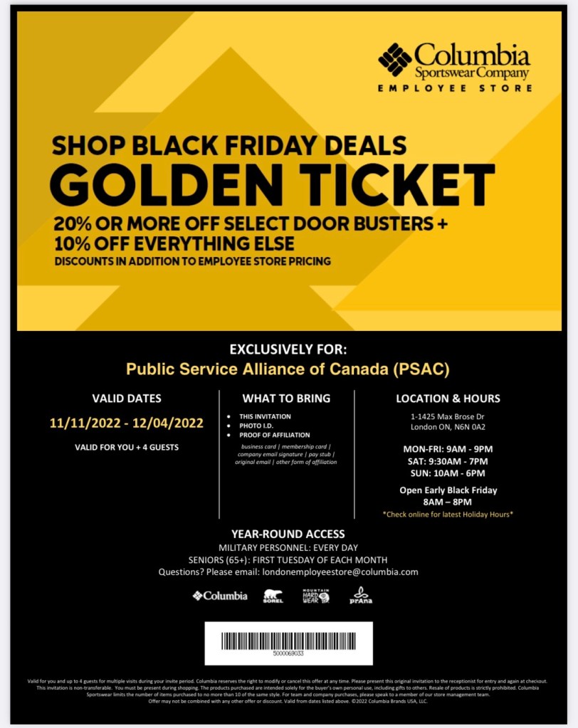 Columbia Sportswear Employee Store – Invite Attached for Public Service Alliance of Canada (PSAC)