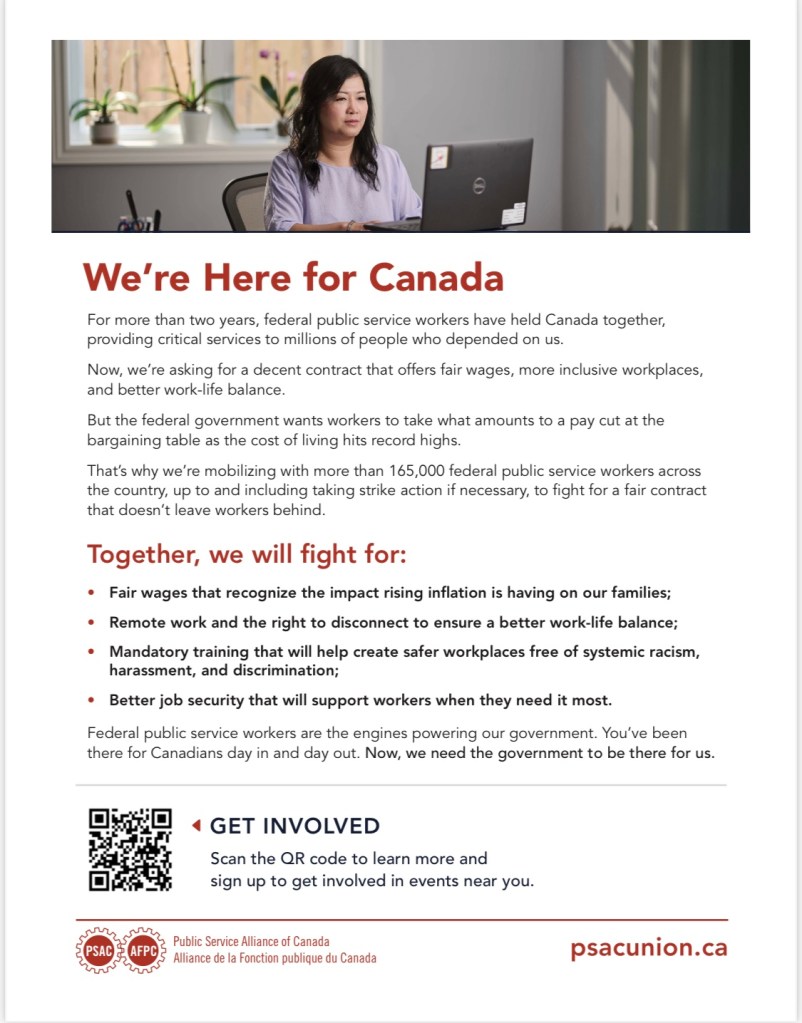 Also, join us in our national online bargaining update and action over Zoom with our PSAC National President, Chris Aylward on November 28th at 7 PM. Register Here.
