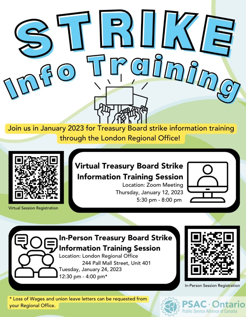 The London Regional Office will be running online and in-person information and training sessions on strikes and mobilization efforts for Treasury Board. The virtual session will run on January 12, 2023 from 5:30 pm – 8:00 pm. The in-person session will run on January 24, 2023 from 12:30 pm – 4:00 pm in the London R.O located at 401-244 Pall Mall Street, London ON.