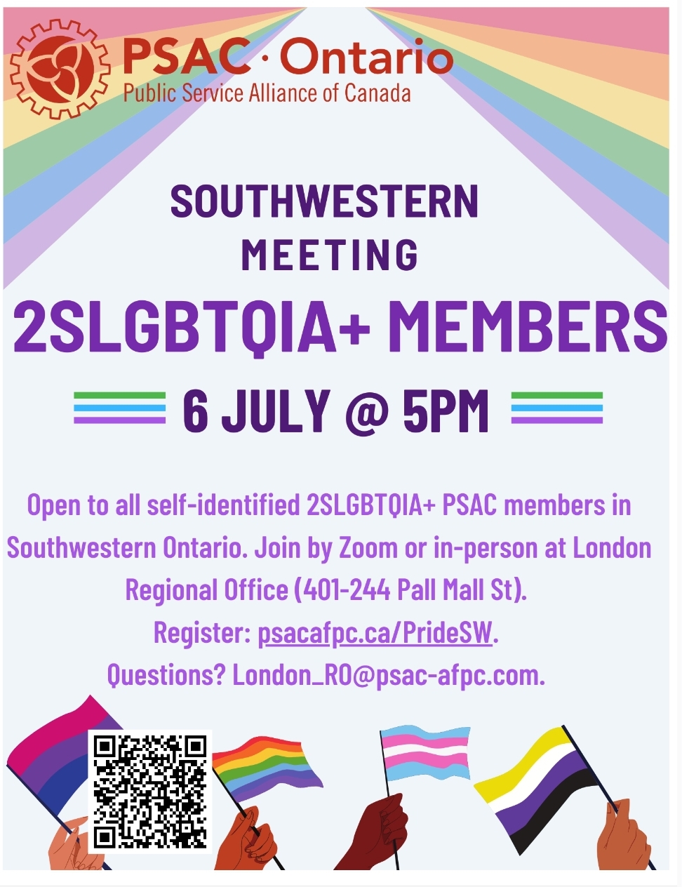 Meeting is open to all self-identified 2SLGBTQIA+ PSAC members** in the Southwestern Region. Register here: psacafpc.ca/PrideSW.