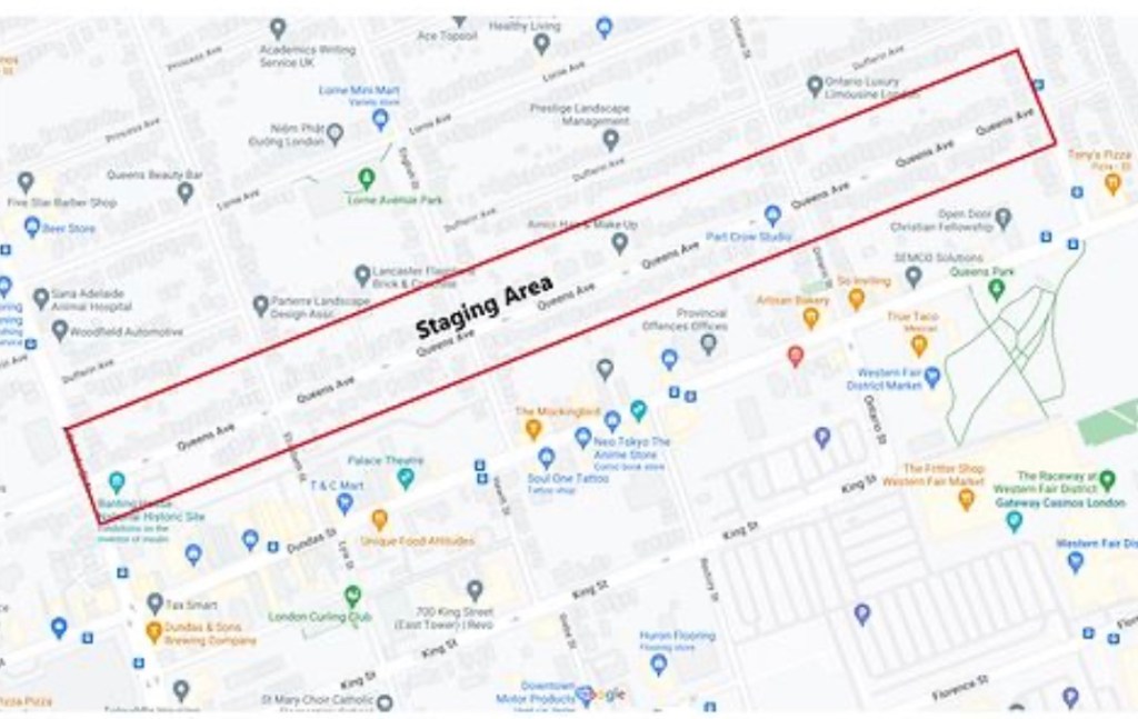 Members may join us at 11:45 AM at the Staging Area on Queen’s Ave (from Quebec St to Adelaide St), and look for PSAC Flags to find us.