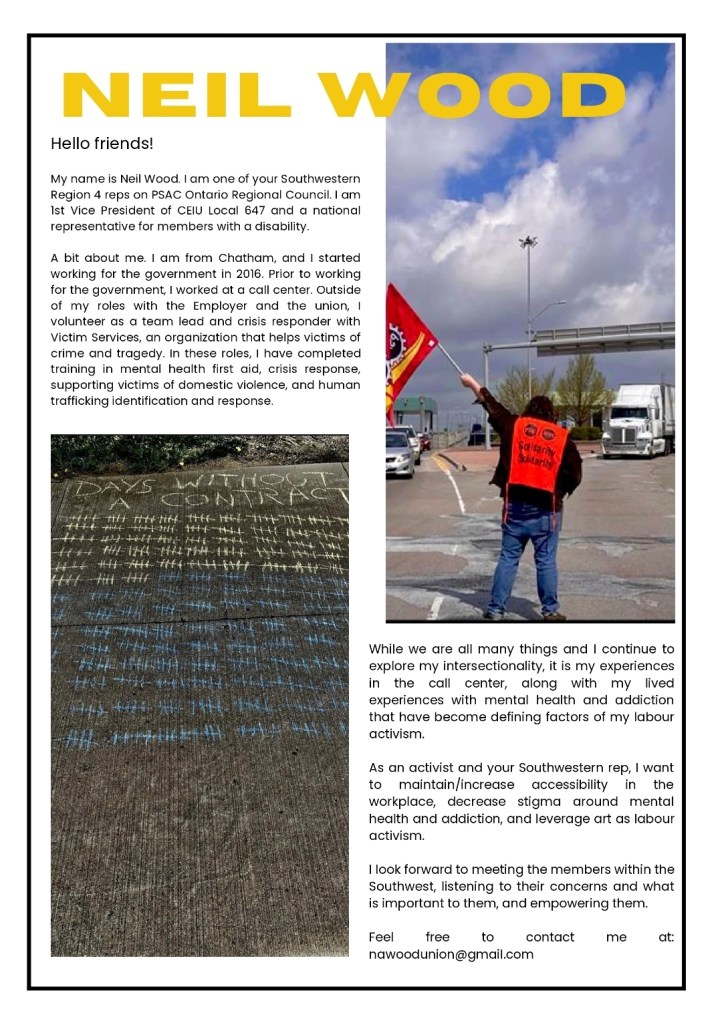 From Neil: My name is Neil Wood. I am one of your Southwestern Region 4 reps on PSAC Ontario Regional Council. I am1st Vice President of CEIU Local 647 and a national representative for members with a disability. A bit about me. I am from Chatham, and I started working for the government in 2016. Prior to working for the government, I worked at a call center. Outside of my roles with the Employer and the union, I volunteer as a team lead and crisis responder with Victim Services, an organization that helps victims of crime and tragedy. In these roles, I have completed training in mental health first aid, crisis response, supporting victims of domestic violence, and human trafficking identification and response. While we are all many things and I continue to explore my intersectionality, it is my experiences in the call center, along with my lived experiences with mental health and addiction that have become defining factors of my labour activism. As an activist and your Southwestern rep, I want to maintain/increase accessibility in the workplace, decrease stigma around mental health and addiction, and leverage art as labour activism. I look forward to meeting the members within the Southwest, listening to their concerns and what is important to them, and empowering them.