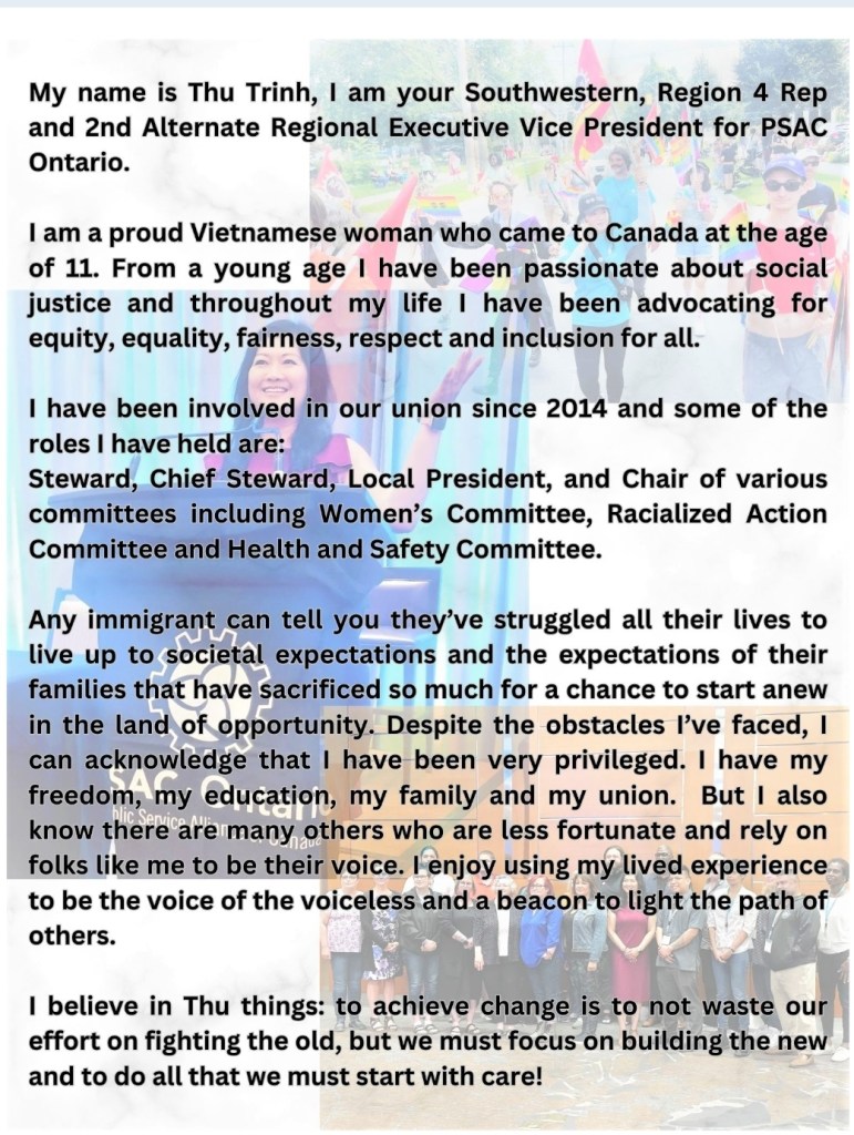 My name is Thu Trinh, I am your Southwestern Region 4 Rep and 2nd Alternate Regional Executive Vice President for PSAC Ontario. I am a proud Vietnamese woman who came to Canada at the age of 11. From a young age I have been passionate about social justice and throughout my life I have been advocating for equity, equality, fairness, respect and inclusion for all. I have been involved in our union since 2014 and some of the roles I have held are: Steward, Chief Steward, Local President, and Chair of various committees including Women’s Committee, Racialized Action Committee and Health and Safety Committee. Any immigrant can tell you they’ve struggled all their lives to live up to societal expectations and the expectations of families that have sacrificed so much for a chance to start anew in the land of opportunity. Despite the obstacles I’ve faced, I can acknowledge that I have been very privileged. I have my freedom, my education, my family and my union. But I also know there are many other who are less fortunate and rely on folks like me to be their voice. I enjoy using my lived experience to be the voice of the voiceless and a beacon to light the path of others. I believe in Thu things: to achieve change is not waste our effort on fighting the old, but we must focus on building the new and to do all that we must start with care!