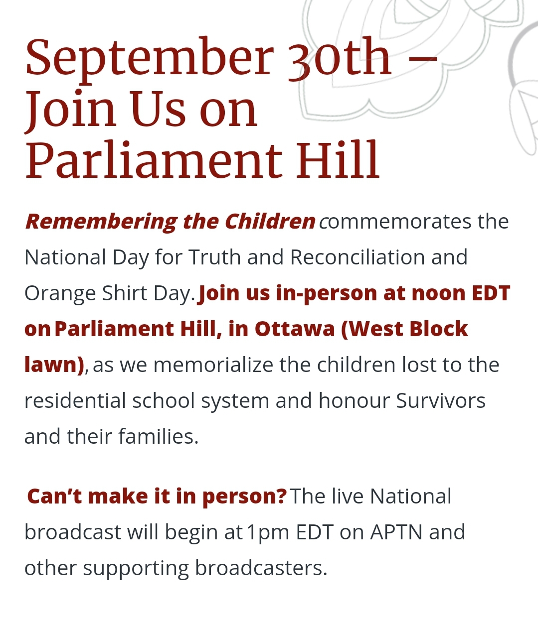 Find some local events on this page or watch the live broadcast from Parliament Hill, wear orange, learn, reflect and honour.(And remember no work Mon. OCT 2ND for our members.)