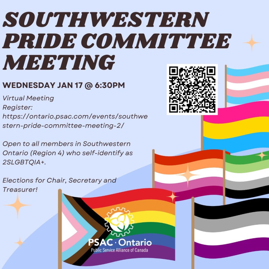 Additional information as well as the link to register can be found here: Southwestern Pride Committee Meeting – PSAC Ontario