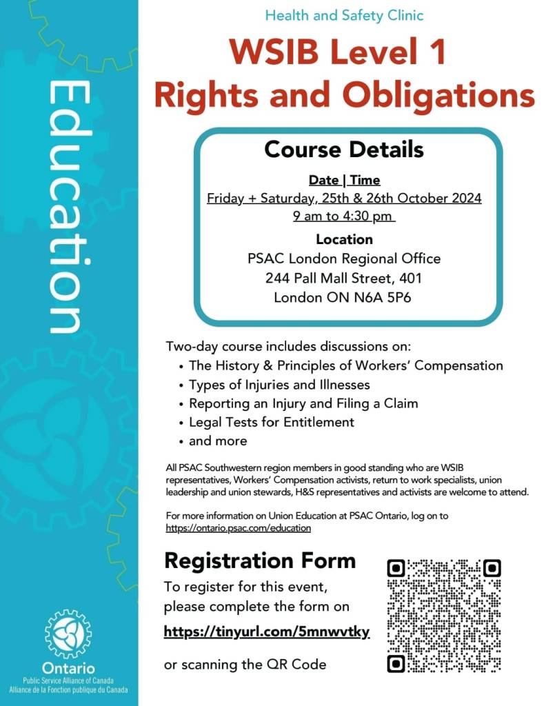 UNION EDUCATION COURSE: WSIB 1 (Rights and Obligations) – Health and Safety ClinicExplore your rights and obligations under the Workplace Safety and Insurance Act. The two-day model is filled with presentations, videos, and discussions and includes the History & Principles of Workers’ Compensation, Types of Injuries and Illnesses, Reporting an Injury and Filing a Claim, Legal Tests for Entitlement, and more. Who should attend: all those members from the Southwestern Ontario region who are WSIB representatives, Workers’ Compensation activists, RTW specialists, union leadership and union stewards, H&S representatives and activists.October 25-26 | Friday + Saturday | 9am – 4:30pmLocation: PSAC London Regional Office – 244 Pall Mall StreetRegistration Link: https://ontario.psac.com/courses/psac-london-ro-wsib-level-1-rights-and-obligations-in-person-october-25-26-2024/Registration deadline: September 30, 2024