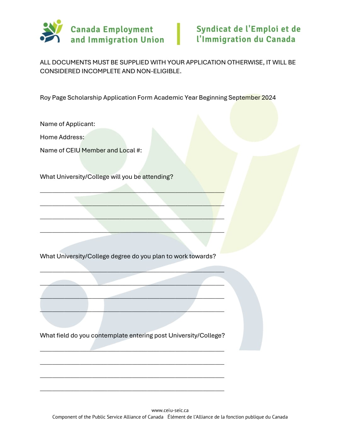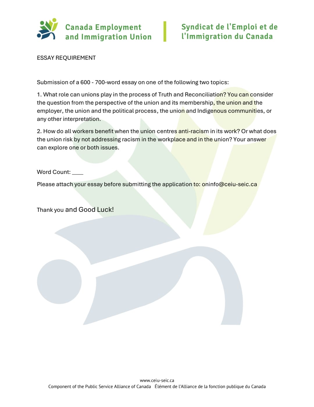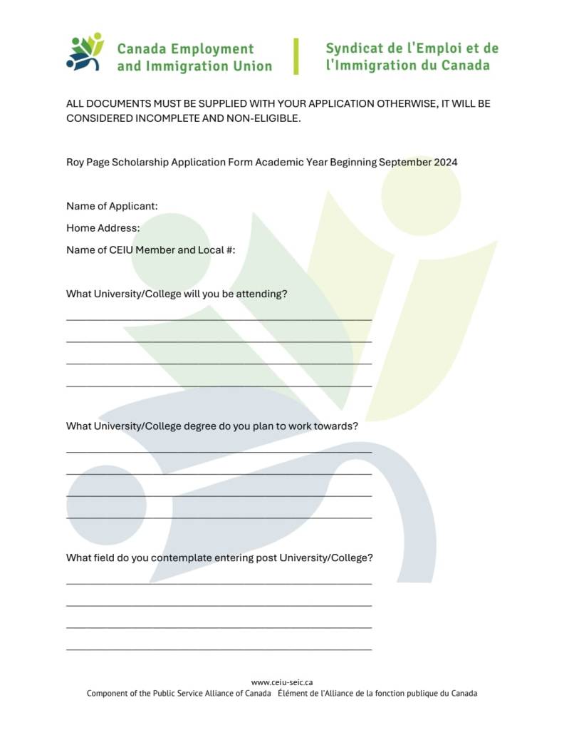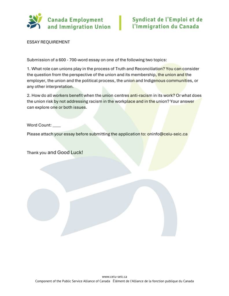 This year’s Scholarship will be awarded to up to two (2) applicants who are in the first year of recognized post-secondary program during the 2024-2025 academic year. Applicants will be assessed on their response to one of two questions: 1. What role can unions play in the process of “truth and reconciliation”? You can consider the question from the perspective of the union and its membership, the union and the employer, the union and the political process, the union and Indigenous communities, or any other interpretation. 2. How do all workers benefit when the union centers anti-racism in its work? Or what does the union risk by not addressing racism in the workplace and in the union? Your answer can explore one or both issues. The deadline for submissions is December 4, 2024. Submission can be made by email to oninfo@ceiu-seic.ca. Please ensure the candidate reviews the form instructions in full and return a completed form with the submission. Do not hesitate to contact oninfo@ceiu-seic.ca if you require any accommodation, assistance or have any questions regarding the application.